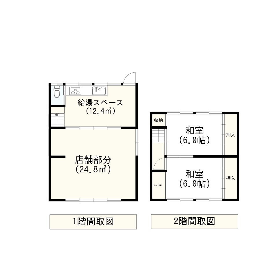 - 1階:店舗スペース、キッチン 2階:和室(6帖)2室
